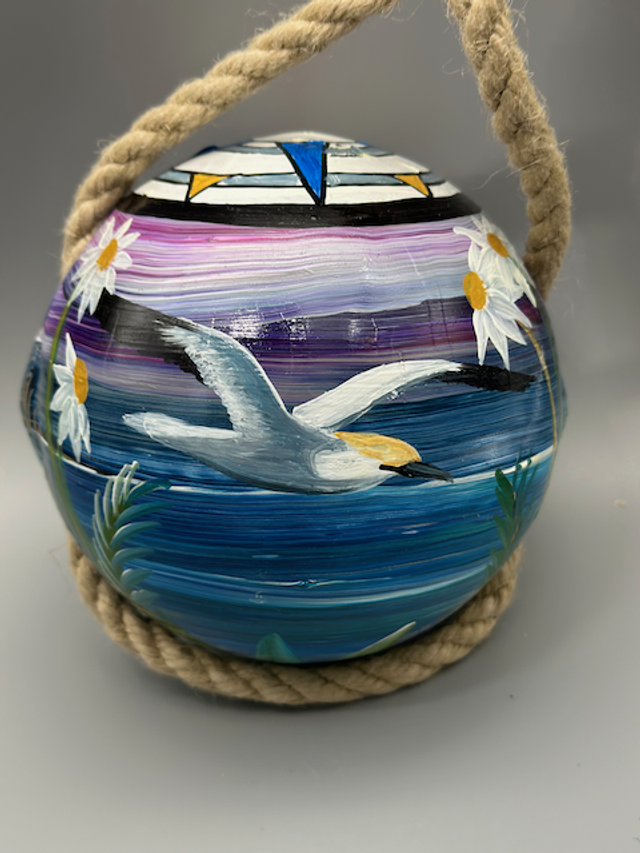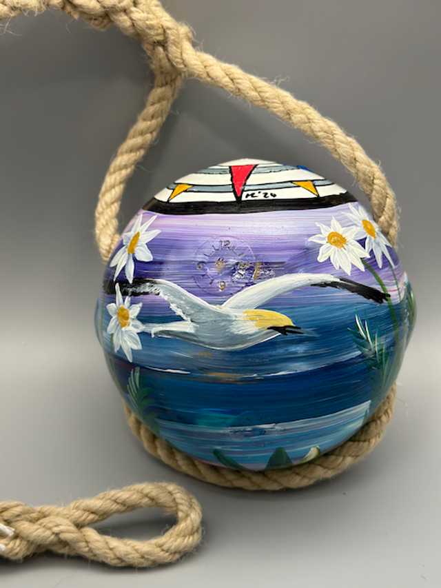 Add a touch of seaside charm to your space with our hand-painted round fishing float hanging ornament. Featuring a unique design inspired by gannets and daisies, each piece is meticulously handcrafted and painted to perfection. These 5" round floats come in a variying colors, although similar, each one s unique. Hang them in your home, office, or outdoor space to add a pop of color and whimsy. Embrace coastal vibes with these beautiful ornaments that are sure to spark conversations and bring a touch of nature indoors.
