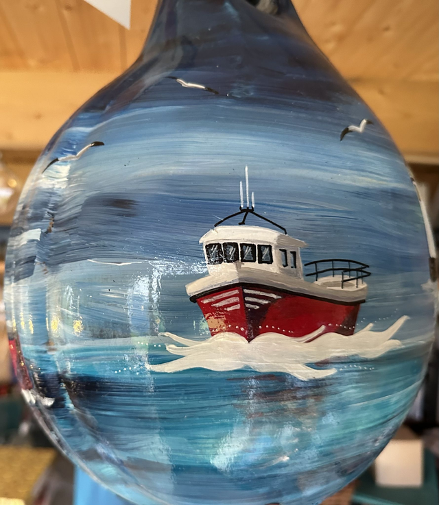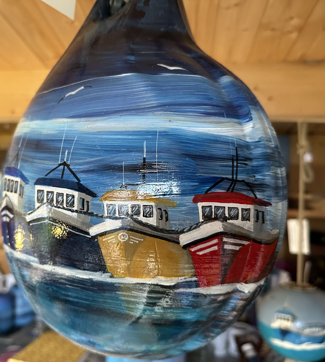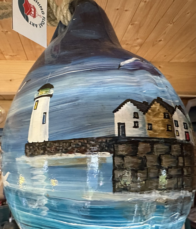 Introducing my unique hanging ornament inspired by harbour life and fishing boats. Handcrafted from a recycled fishing buoy, this fishing float ornament adds a nautical touch to any space. Featuring a lighthouse design, this delightful piece embodies the spirit of safely home. Perfect for boat enthusiasts or those who appreciate coastal decor. Hang it in your home, office, or by the seaside for a charming touch. This one-of-a-kind ornament is a great conversation starter and a wonderful addition to any collection. Stand out with our beautifully crafted fishing float ornament today!